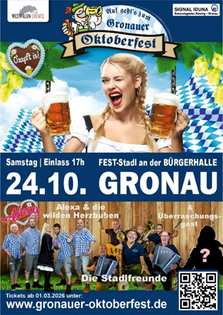 "O’zapft is!" (Het is getapt!) zal opnieuw de kreet zijn op het grootste regionale Oktoberfest van Gronau. Na de zeer succesvolle edities van de afgelopen jaren kunnen bezoekers zich verheugen op een authentieke Oktoberfestsfeer in de feestelijk versierde tent naast de Bürgerhalle op zaterdag 24 oktober 2026.